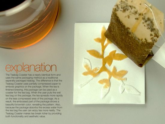 Em vez de deitar fora o saquinho de chá usado, pouse-mo-lo no pequeno pacote de papel que o continha para que arte - mais do que a do ritual da bebida imemorial - se desvele. Um maravilhoso conceito criado por Yuree S Lim e Jleun Yang, descoberto aqui.